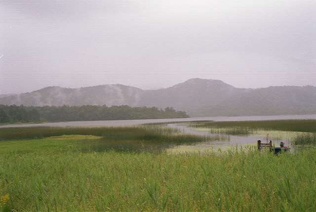 シシウドの花もかなりありました。尾瀬沼のほとりのゲストセンターにてしばらく雨のやむのを待ちましたが、状況が変わらないため、 出発です。 右手に燧ヶ岳を眺めながら進みます。 途中トイレ休憩を入れた後、沼尻まで進みます。沼尻では月見うどんを食べましたが、 水がよいせいか、つゆがとてもおいしく、なかなかの物でした。